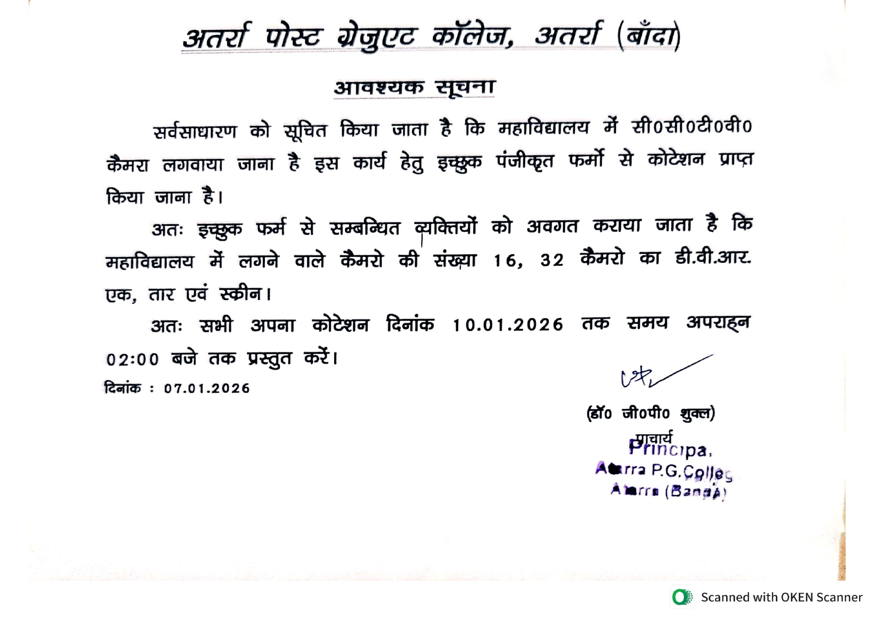 - महाविद्यालय में CCTV कैमरा लगवाए जाने हेतु कोटेशन प्राप्त करने के सम्बन्ध में सूचना